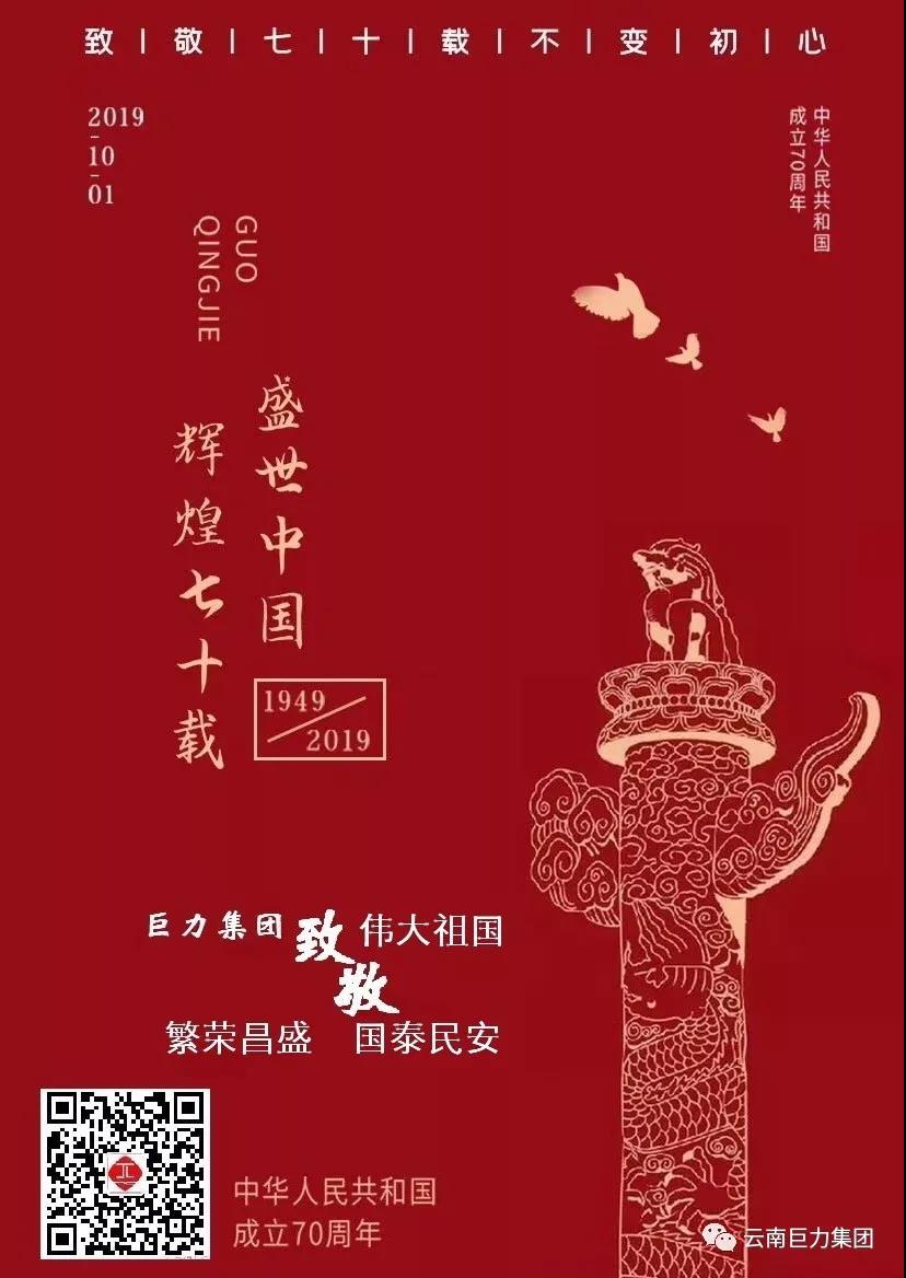 值此新中國(guó)成立70周年之際,巨力集團(tuán)衷心祝福我們的偉大祖國(guó)更加繁榮昌盛,祝愿中華大地國(guó)泰民安。也祝愿所有員工客戶和各界朋友節(jié)日快樂(lè)!