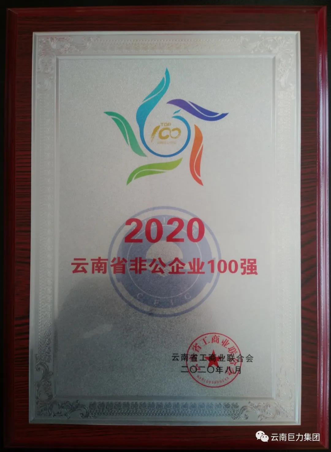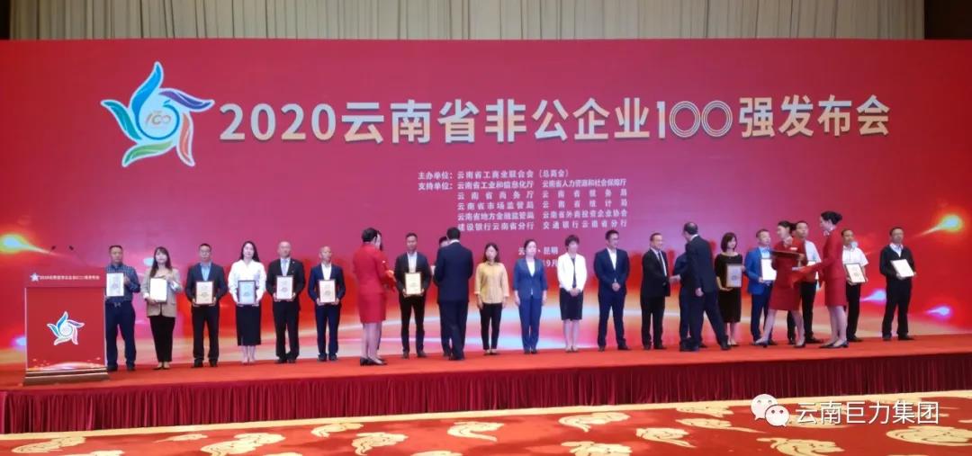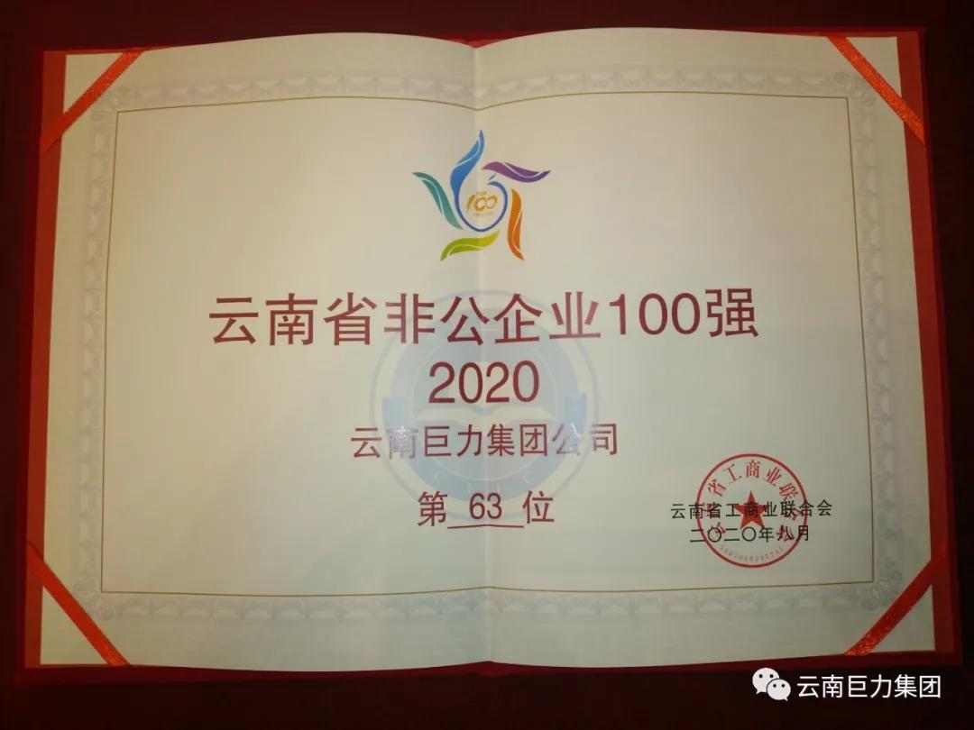 云南巨力集團榮獲2020年“云南省非公企業(yè) 100 強”第63位