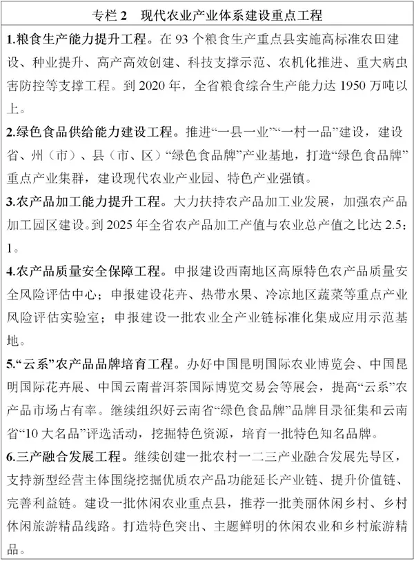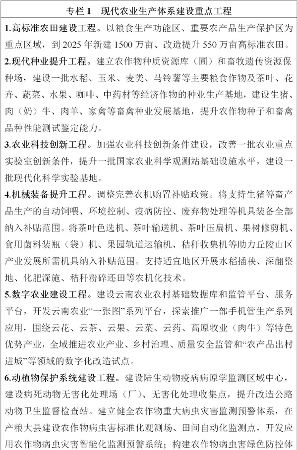 全力穩(wěn)定糧食綜合產(chǎn)能。堅持藏糧于地、藏糧于技,樹立大食物安全觀,立足糧食供需平衡區(qū)的基本省情,確保糧食種植面積穩(wěn)定在6250萬畝左右,在93個稻谷、玉米、小麥等糧食生產(chǎn)重點縣(市、區(qū))集中連片建設(shè)糧食生產(chǎn)核心區(qū),打造一批綠色高質(zhì)高效示范基地。在“九湖兩江”流域大力推廣“水稻+”綜合種養(yǎng)模式,探索水稻田保護(hù)和農(nóng)業(yè)綠色生態(tài)發(fā)展路徑。努力挖掘糧食生產(chǎn)潛能,大力發(fā)展晚秋糧食生產(chǎn)和冬季農(nóng)業(yè)開發(fā),擴大小雜糧、小雜豆、馬鈴薯、鮮食玉米等糧食作物面積。到2025年,全省糧食產(chǎn)量達(dá)1950萬噸?v深推進(jìn)特色產(chǎn)業(yè)發(fā)展。圍繞糧食、茶葉、花卉、水果、蔬菜、堅果、咖啡、中藥材、生豬、肉牛等“綠色食品牌”重點產(chǎn)業(yè),深入實施“一二三”行動,打造“一縣一業(yè)”,抓住種子和電商兩端,推進(jìn)設(shè)施化、有機化、數(shù)字化發(fā)展。到2025年,“綠色食品牌”重點產(chǎn)業(yè)綜合產(chǎn)值實現(xiàn)翻番。穩(wěn)定糖料蔗產(chǎn)能。鞏固臨滄市、普洱市、德宏州、西雙版納州等適宜區(qū)種植面積,加快中低產(chǎn)蔗田改造,加強適宜丘陵山地機具的研發(fā)和推廣應(yīng)用,到2025年,全省糖料蔗產(chǎn)量穩(wěn)定在1600萬噸左右。促進(jìn)橡膠產(chǎn)業(yè)轉(zhuǎn)型升級。擴面增產(chǎn)、強質(zhì)提特、輻射全國,西雙版納州、普洱市等地區(qū)加快發(fā)展特種膠園,因地制宜發(fā)展生態(tài)膠園,打造國內(nèi)天然橡膠生產(chǎn)供應(yīng)主基地。加快綠色生態(tài)漁業(yè)發(fā)展。