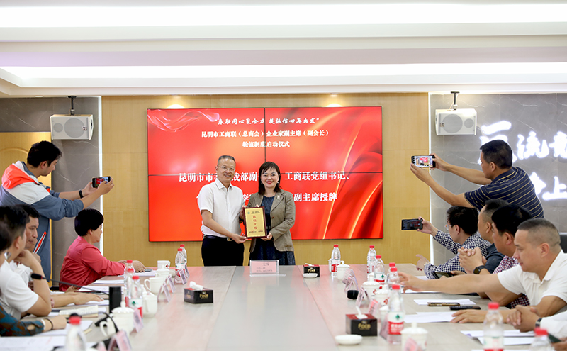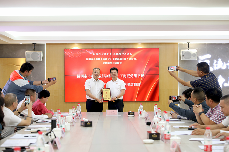 啟動儀式上,李富貴書記首先向王國新、張艷萍、楊志云三位輪值副主席授牌。并對工商聯(總商會)企業(yè)家副主席(副會長)輪值制度進行了深入解讀,他表示,昆明市工商聯從本月起,實行兼職副主席(副會長)輪值制度。這是市工商聯認真學習貫徹黨的二十大精神和黨中央關于支持民營經濟發(fā)展,認真學習貫徹習近平總書記關于支持民營經濟發(fā)展系列重要指示精神,在新時代推動民營經濟發(fā)展的大背景下,推出的一項重大新舉措。市工商聯這次輪值制度實行1+2+1模式(一位輪值主席,兩位副主席為一個輪值工作組,每組輪值一個月)。輪值期間,要圍繞在開展有針對性的調研、走訪座談,了解會員企業(yè)相關情況,幫助企業(yè)解決困難和問題等5項輪值重點內容,切實履行好8項具體的輪值職責。