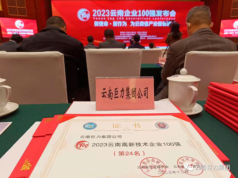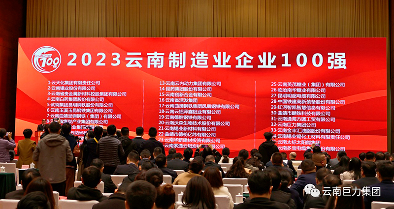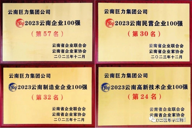 2023年12月16日上午,云南省企業(yè)家聯(lián)合會(huì)、云南省企業(yè)家協(xié)會(huì)在云南海埂會(huì)堂召開“2023 云南企業(yè) 100 強(qiáng)”發(fā)布會(huì)。云南巨力集團(tuán)榮獲:“2023云南企業(yè)100強(qiáng)”“2023云南民營(yíng)企業(yè)100 強(qiáng)”“2023云南制造業(yè)企業(yè)100強(qiáng)”“2023云南高新技術(shù)企業(yè)100強(qiáng)”四項(xiàng)殊榮。